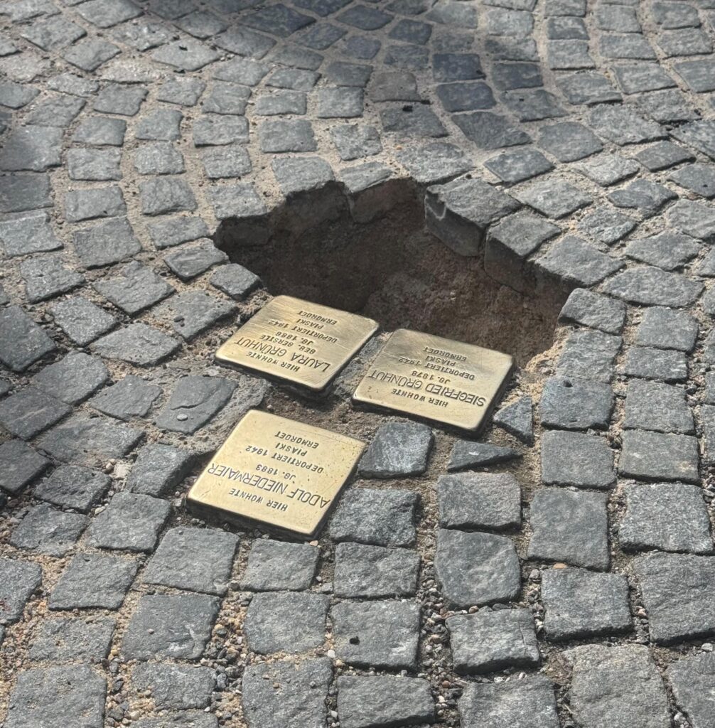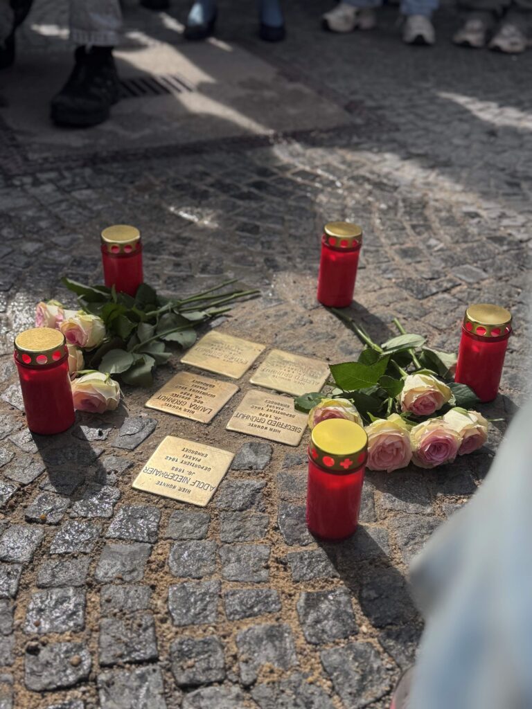 Ausgestattet mit Scheuermittel, Putzschwamm und Politur brachten die Kinder die Steine gemeinsam wieder zu glänzen und machten Schriftzüge wieder sichtbar – damit Geschichte sichtbar bleibt. Mittlerweile gehören 300 Stopersteine, die auf Pflaster und Gehwegen verlegt wurden, fest zum Stadtbild. Anlass dieser gemeinsamen Reinigungsaktion war die Stolpersteinverlegung für Esther und Alfred Grünhut am Platz der Einheit am Dienstag, den 24.03.2026. „Diese Steine erinnern an Menschen, die Opter des Nationalsozialismus wurden. An ihrem letzten, frei gewählten Wohnort, mitten in unserer Stadt, mitten im Alltag“, fasste es Kellner-Mayrhofer während der Steinverlegung zusammen. Zu diesem Anlass reiste Herr Ilan Peer, der Sohn von Esther Grünhut aus den USA an. Der Schulchor der St.-Wolfgang-Mittelschule begleitete die Veranstaltung musikalisch. Schülerinnen der 8aM zündeten nach der Steinverlegung Kerzen an. Am Ende stand ein Veranstaltung rundeten die Schüler der 6a die Steinverlegung mit einem Vortrag über die Würde des Menschen ab. Die Anwesenheit so vieler Schulklassen finde sie großartig, sagte Feichtmayer-Arnold. „Dadurch wird den Schülern ermöglicht, dass sie mal andere Erfahrungen sammeln und auf diese Weise in Erinnerungskultur eingebunden werden können. Etwas sehr Wichtiges und ich hoffe, ihr vergesst diese Erinnerung auch nicht.“